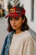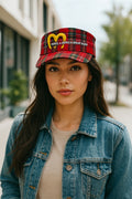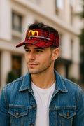 🧢 Unique Design: Red plaid pattern with embroidered slogan and golden “M” emblem.